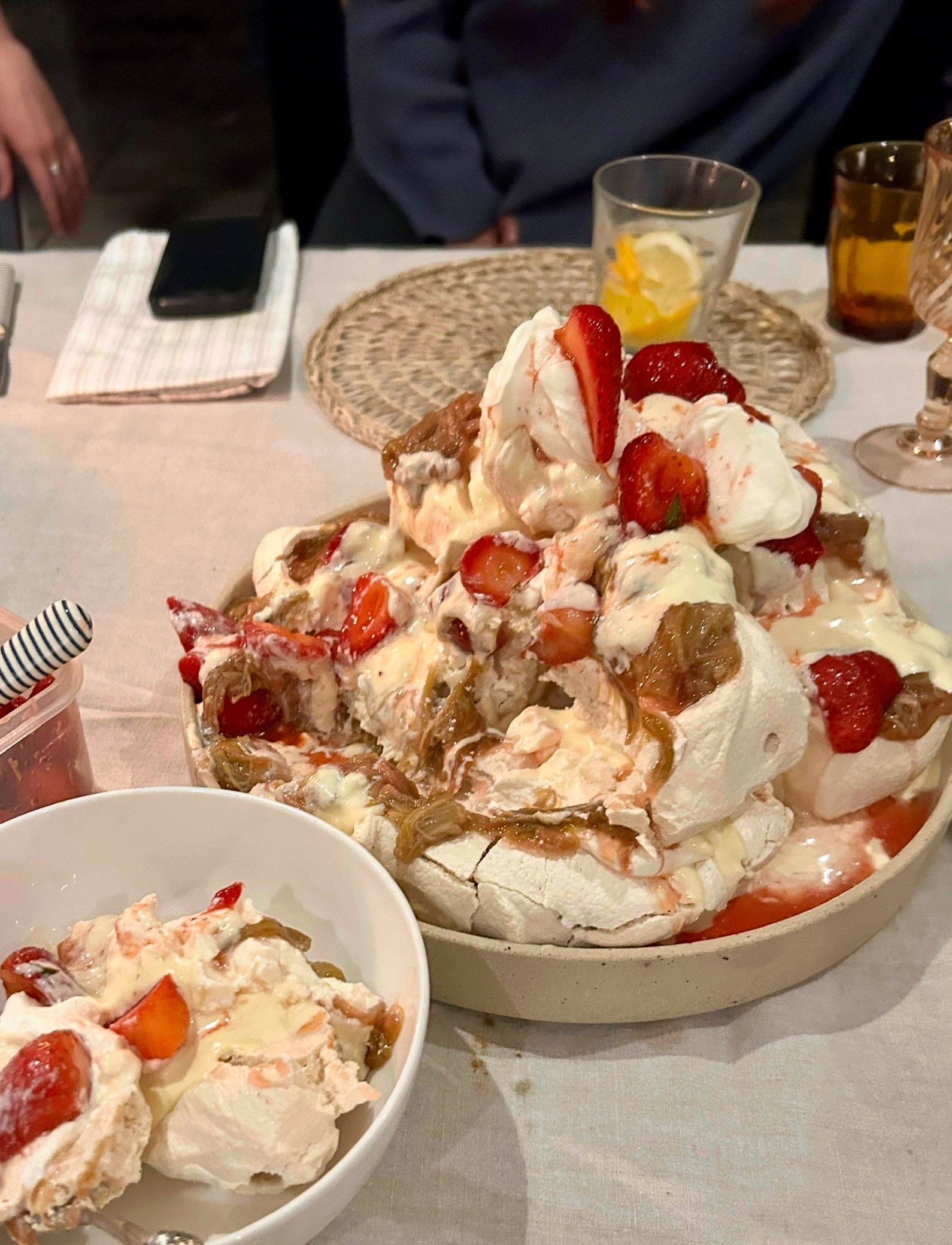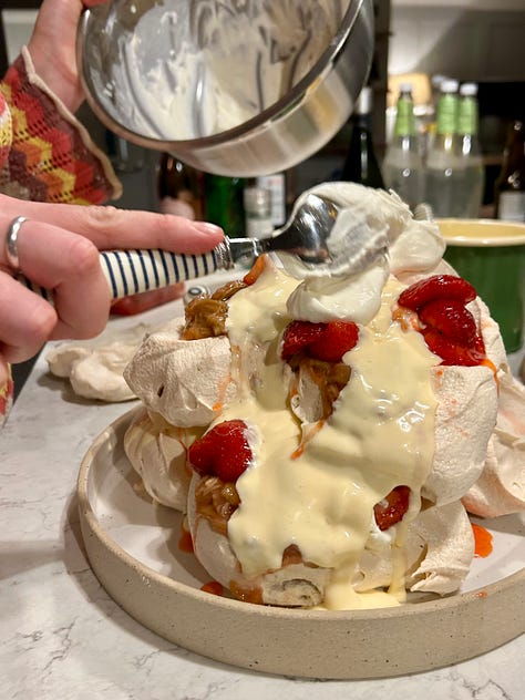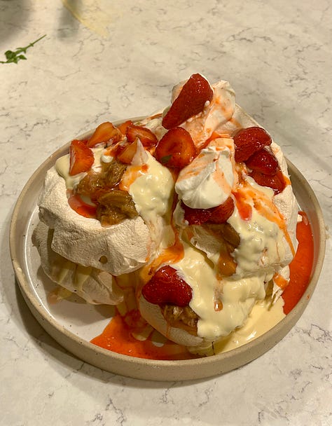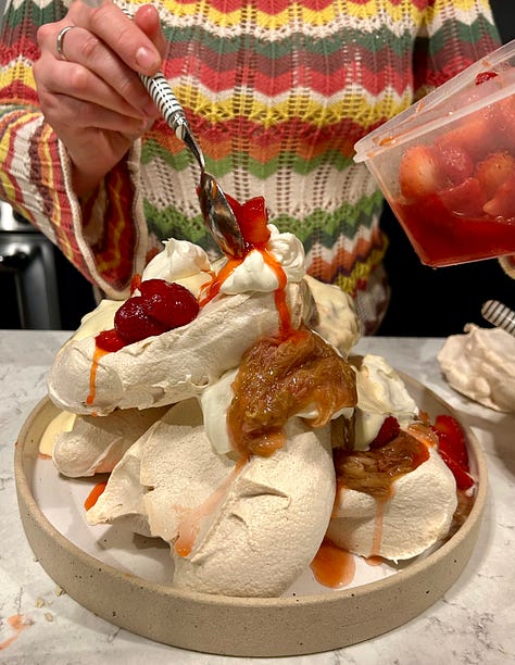 I made a compote from the rhubarb by adding some caster sugar, orange zest and juice to a pan, popping the lid on and leaving the rhubarb to break down. I macerated the strawberries in sugar and lemon juice and left them in the fridge for most of the day allowing them to go super sweet and create the brightest red syrup to be drizzled over the pavlova at the end. The custard was your standard recipe except I added a couple of tablespoons of cornflour in with the eggs and sugar so that it held its own amongst all of the fruit and meringue. I finished it with peaks of softly whipped cream, and the only thing missing was a giant sparkler coming out of the top.
