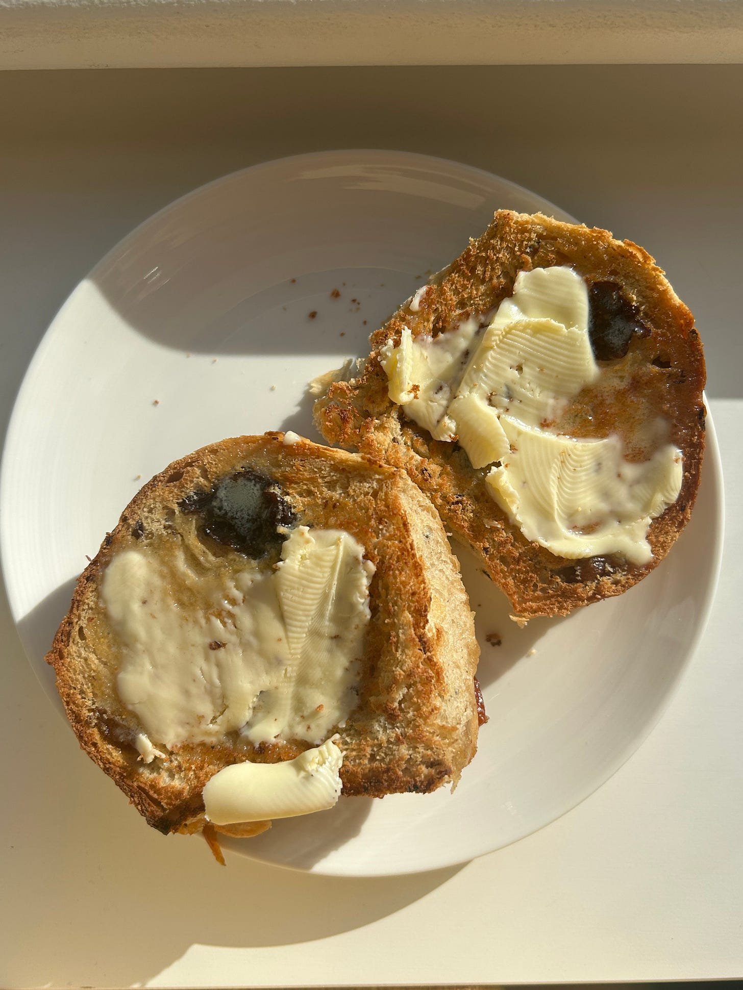 Toasted under the grill (because they were too big to fit in the toaster), and slathered with salty butter.